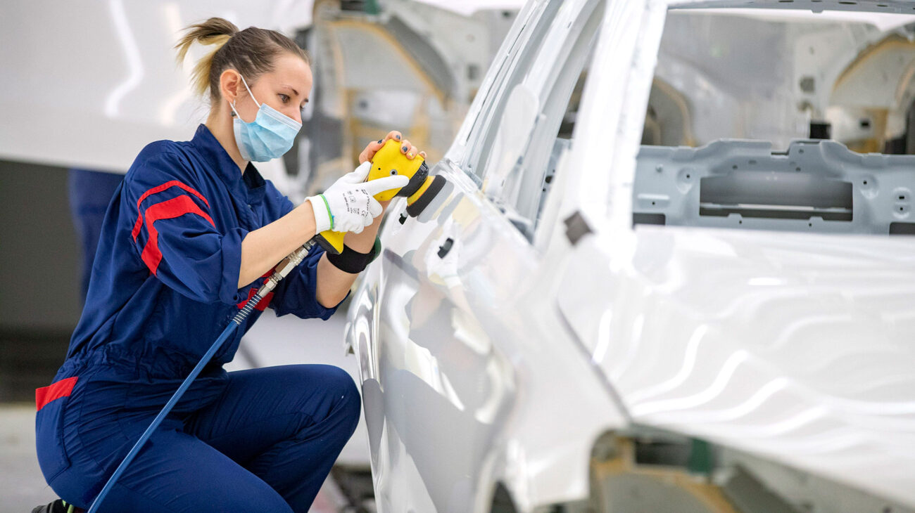 Työntekijöille on tärkeää päästä vaikuttamaan työtapaan ja työtahtiin. Kuvassa Olesya Gzieva viimeistelee maalipintaa Valmet Automotiven tehtaalla. Kuva Roni Lehti Lehtikuva.