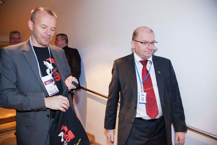 IndustriALL Globalin pääsihteeri Jyrki Raina ja Metallin puheenjohtaja Riku Aalto tulossa Metallin liittokokouksen avajaisiin.