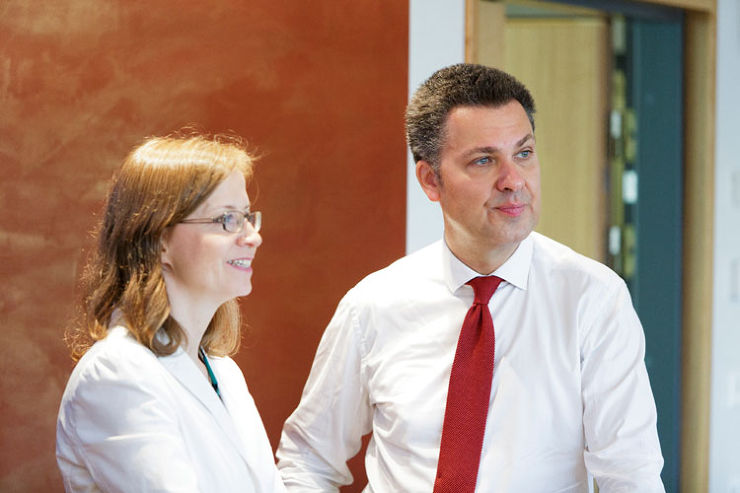EAY:n tuleva pääsihteeri italialainen Luca Visentini tapasi suomalaisten keskusjärjestöjen ja liittojen edustajia SAK:ssa. Kuvassa Visentini ja SAK:n kansainvälisten kansainvälisten asioiden päällikkö Katja Lehto-Komulainen.