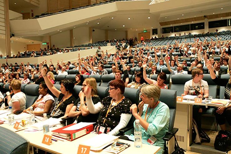 Kuva äänestyksestä SAKn vuoden 2011 edustajakokouksesta.