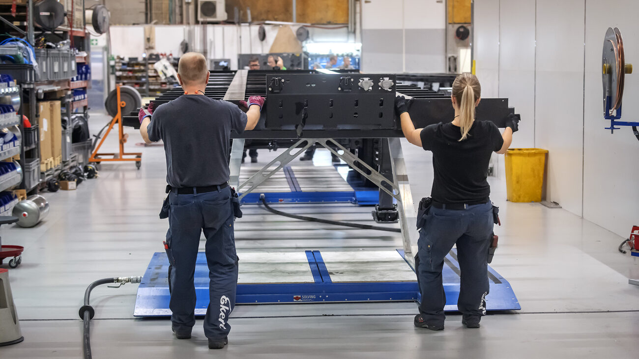 Perävaunun valmistus alkaa hitsaushallissa rungon kokoamisella. Siihen tarvitaan yleensä kaksi työntekijää, jotka seuraavat mukana, kun runko siirtyy ilmatyynyjen päällä asennusasemasta toiseen. Meidän vieraillessamme tehtaalla Tomas Strömin urakka on juuri edennyt viimeiseen vaiheeseen.