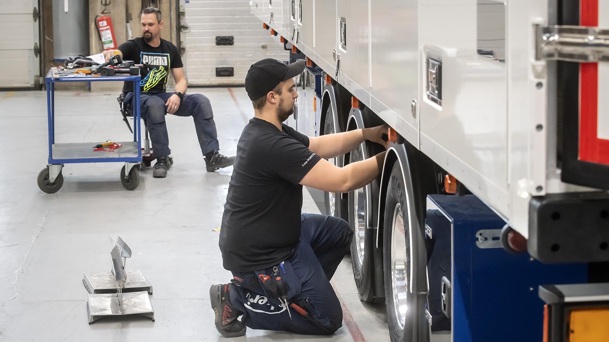 Kun Silander työtovereineen on asentanut ovet paikalleen, perävaunu jatkaa maalaamoon. Sieltä se siirtyy loppuasennukseen, jossa yksi työntekijöistä on Simon Punsar.