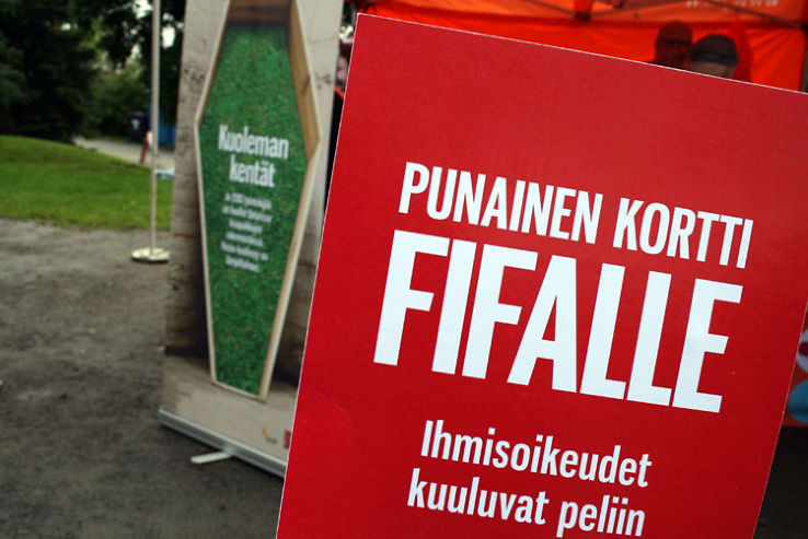 Punainen kortti FIFALLE -kampanja vaatii kansainvälistä jalkapalloliittoa kantamaan vastuuta työntekijöiden oikeuksista ja työskentelyolosuhteista.