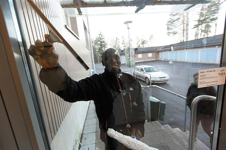 Njie ja Alhassan siivoavat asukastaloja Helsingin Herttoniemessä. Eri uskonnot ovat työpaikalla arkipäivää, sillä kaikki oman alueen työntekijät ovat ulkomaalaisia. Koko Palmiassa puolet siivoojista tulee ulkomailta. Äidinkieliä on satoja.