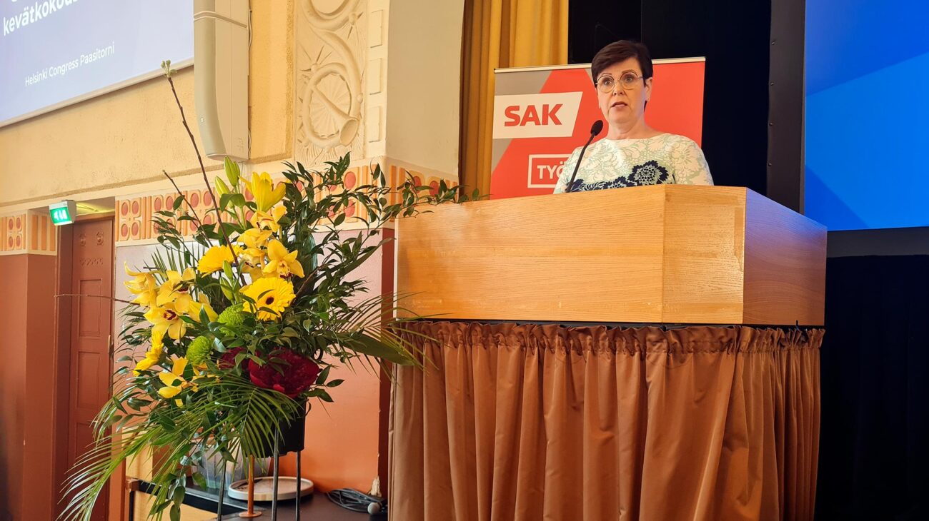 SAK:n hallituksen varapuheenjohtaja Katja Syvärinen SAK:n edustajiston kokouksessa.