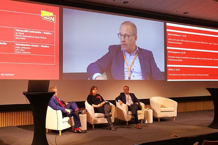 Marina Congress Centerin lavalla toimittaja Jan Erola, futuristi Elina Hiltunen ja SAK:n puheenjohtaja Jarkko Eloranta