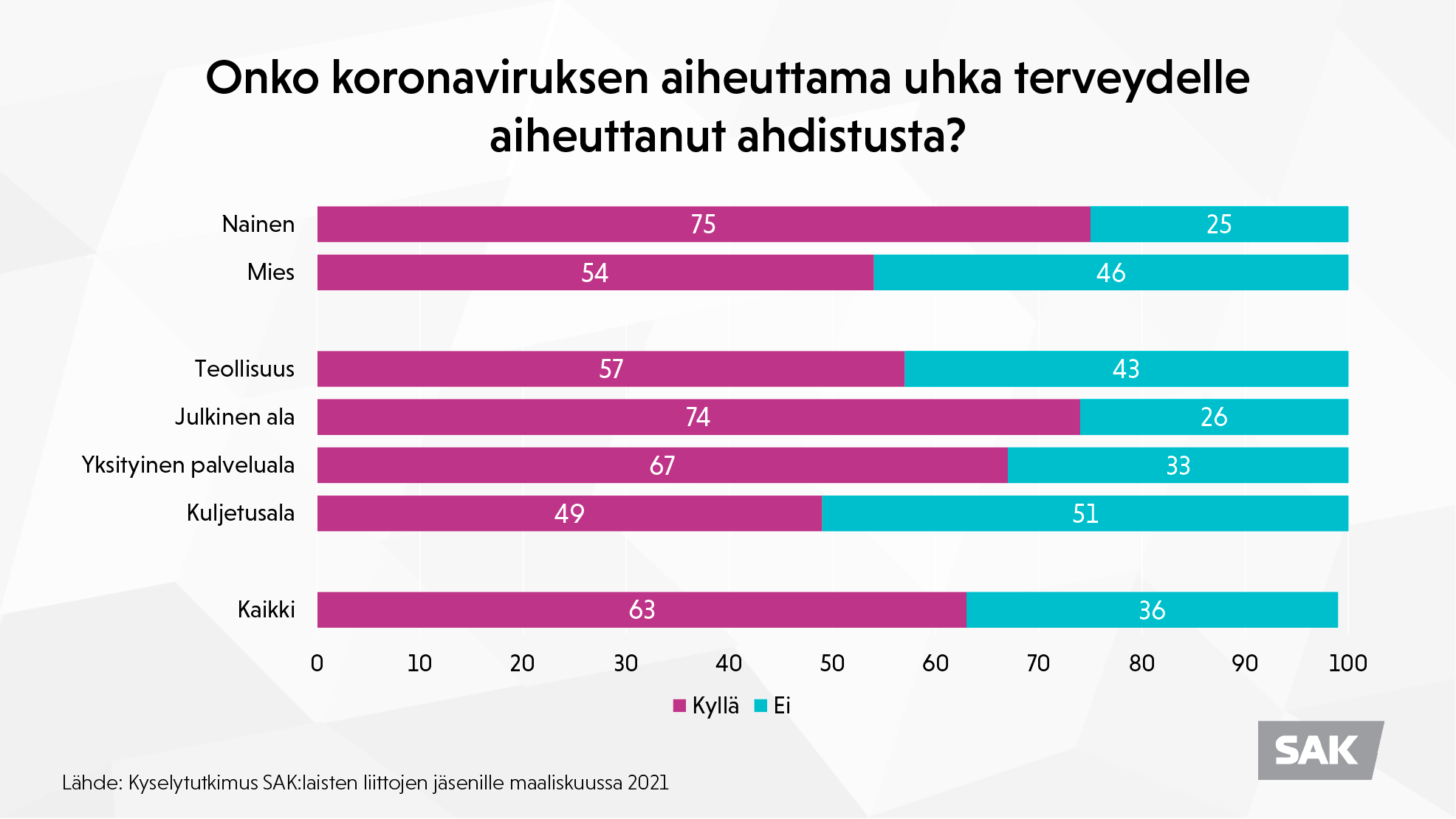 Kyselytutkimuksen ennakkotietojen mukaan SAK:laisten liittojen jäsenistä melkeinpä kaksi kolmesta (63 %) kertoo olleensa ahdistunut koronaviruksen aiheuttaman terveydellisen uhkan vuoksi. Useimmiten ahdistusta ovat kokeneet julkisella sektorilla (74 %) sekä palvelualalla työskentelevät SAK:laisten liittojen jäsenet.