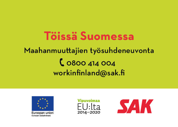 Maahanmuuttajien työsuhdeneuvonta on auki maanantaista torstaihin klo 9–11 ja 12–15. Puhelinnumero on 0800 414 004. Sähköpostiosoite on workinfinland@sak.fi.