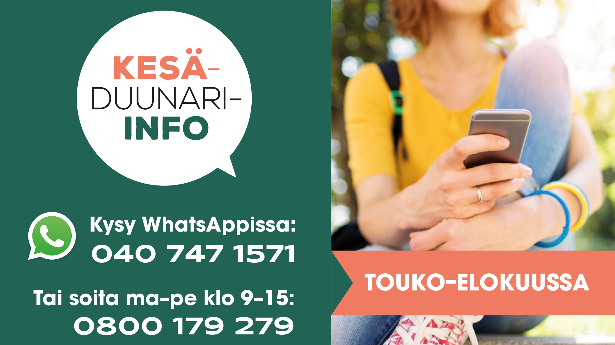 Kesäduunari-info aukeaa tänään maanantaina 4. toukokuuta ja palvelee perjantaihin 28. elokuuta asti. Kesäduunarineuvojan tavoittaa arkisin kello 9–15 puhelimitse numerosta 0800 179 279 tai WhatsApp-sovelluksella numerosta 040 747 1571. Käytössä on myös sähköinen yhteydenottolomake Kesäduunari-infon sivuilla. Neuvontaa saa suomeksi, ruotsiksi ja englanniksi. Palveluun voi ottaa yhteyttä nimettömänä.