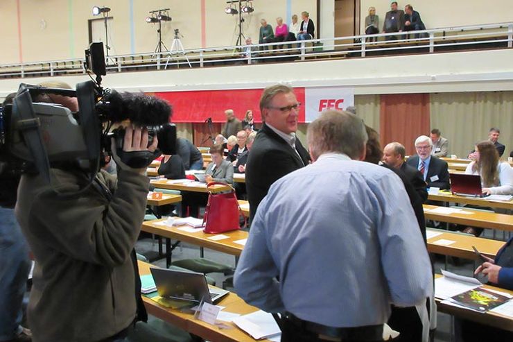 Matti Huutola SAK:n valtuuston kokouksessa torstaina.