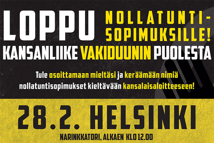 Operaatio Vakiduuni järjestää lauantaina mielenosoitukset Helsingissä ja Kuopiossa. Kampanja kerää nimiä kansalaisaloitteeseen, jossa vaaditaan nollatyösopimusten kieltämistä.
