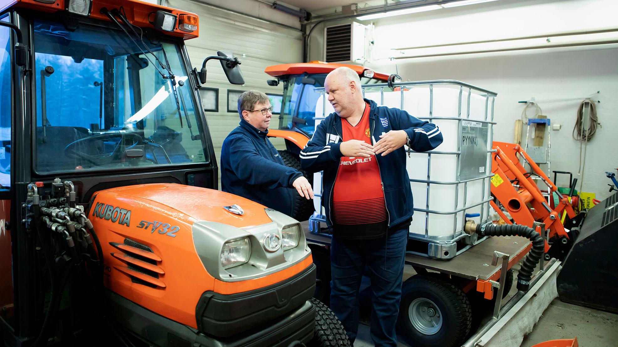 Liikuntapaikkamestarit Jere Helenius (vas.) ja Roy Mäkinen koettavat aina muistaa, mitä työfysioterapeutti koulutuksessa sanoi: nosta isot esineet kaverin kanssa. Kuva Kristiina Kontoniemi.