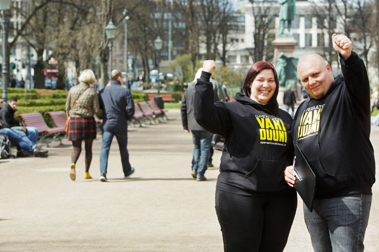 − Esimerkiksi helmikuisena lauantaina oli Operaatio Vakiduuni -mielenilmaus Tampereella. Hyppäsimme autoon perjantaina heti töiden jälkeen ja hurautimme Tampereelle. Perjantaina kävimme syömässä ja stand upissa. Lauantaina oltiin sitten heti aamusta valmiita mielenilmaukseen, kertoo Heidi.