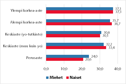Erot muihin koulutusasteisiin ovat hälyttäviä. Keskiasteen tutkinto nostaa työuran odotearvon miehillä yli 32:een ja naisilla yli 33 vuoteen. Korkeakoulututkinnon suorittaneiden keskimääräiset työurat kipuavat 36 vuoden tuntumaan tai sen yli.