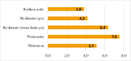 Peruskoulun varaan jääneille kertyy työikäisinä keskimäärin lähes kahdeksan työttömyysvuotta. Ammattikorkea- tai yliopistotutkinto puolittaa työttömyysvuosien määrän.