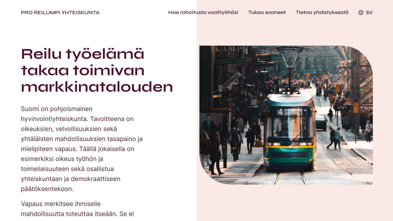 Kuvakaappaus Pro reilumpi yhteiskunta ry:n verkkopalvelun etusivusta.
