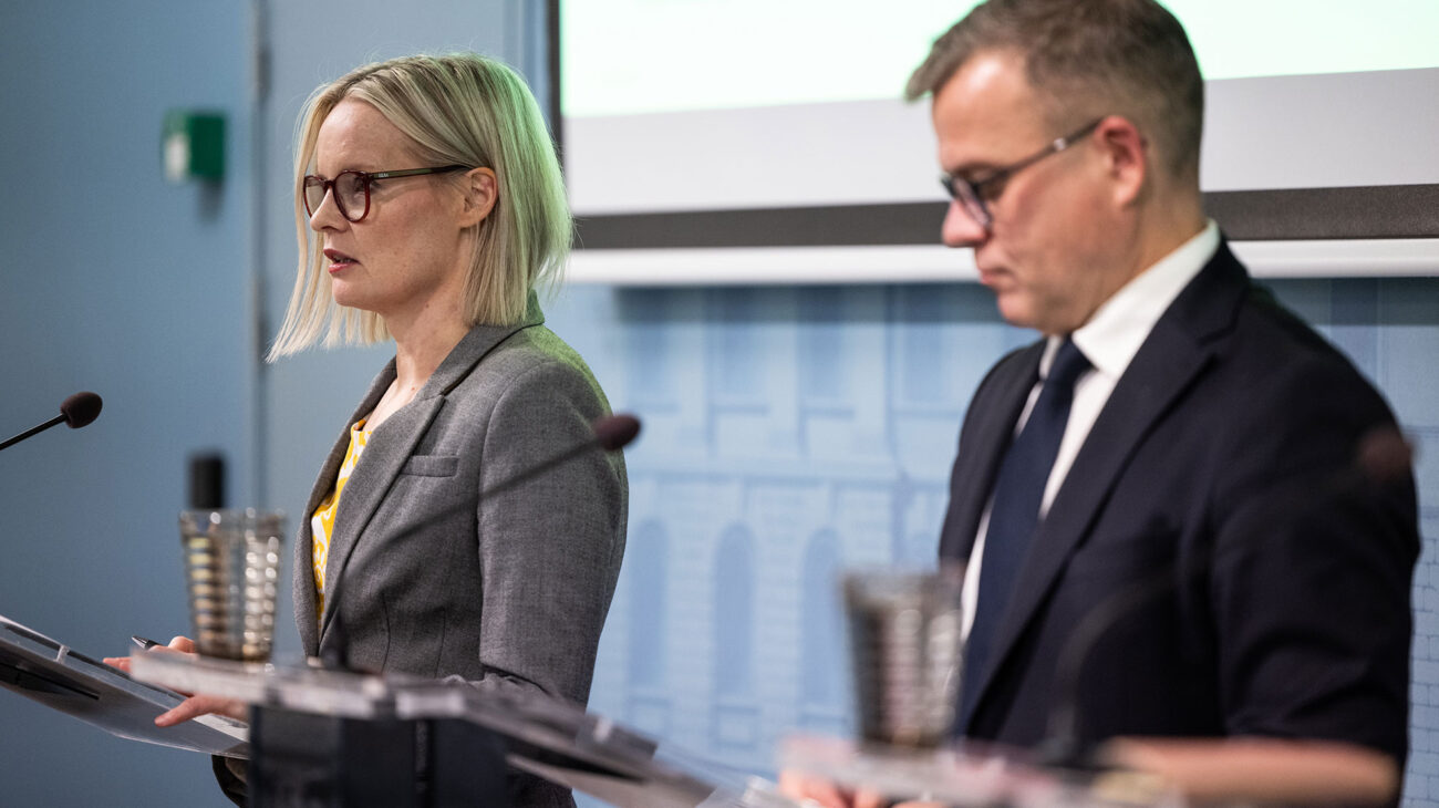 Valtiovarainministeri Riikka Purra ja pääministeri Petteri Orpo budjettiriihen tiedotustilaisuudessa. Kuva: Fanni Uusitalo / Valtioneuvoston kanslia / Creative Commons (CC-BY-2.0)