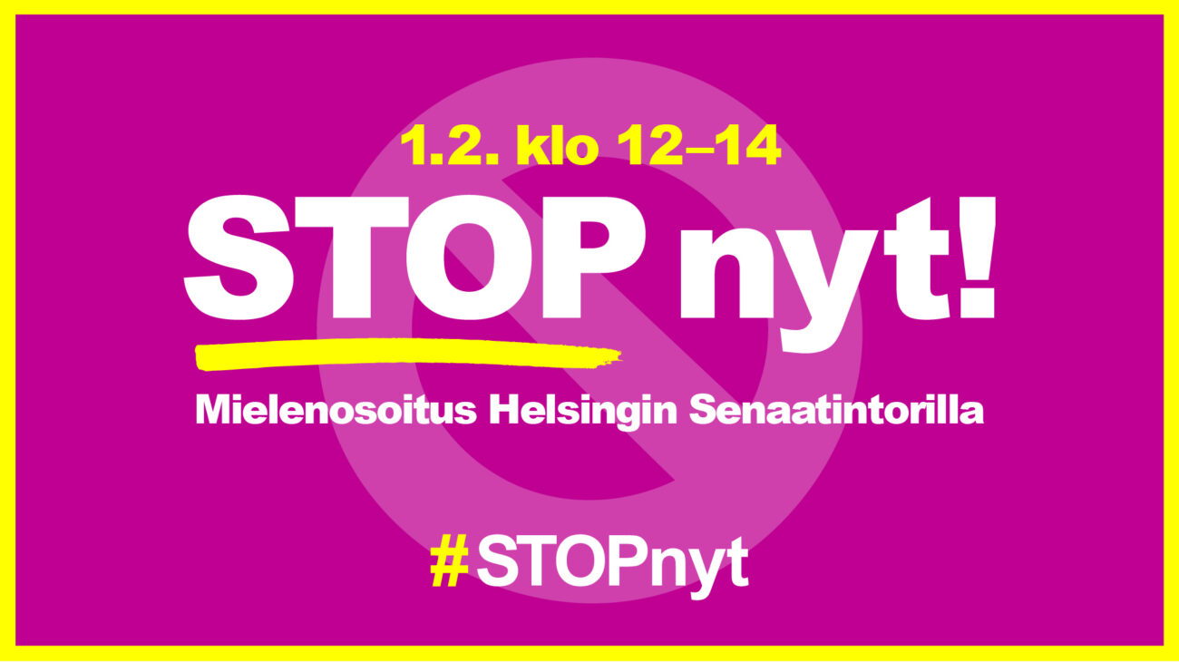 Stop nyt! -mielenosoitus järjestetään Helsingissä Senaatintorilla.