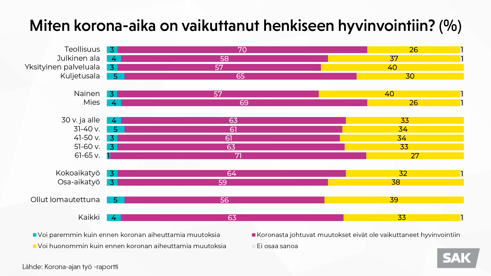 Korona-aika ei jäsenkyselyn perusteella näytä vaikuttaneen kovinkaan kielteisesti työpaikkojen ilmapiiriin. Valtaosa SAK:laisten liittojen jäsenistä kokee, että työpaikalla puhalletaan yhteen hiileen (92 %), koronan vaikutuksista keskustellaan työpaikalla avoimesti työnantajan ja henkilöstön välillä (88 %) ja muutokset ovat koskeneet kaikkia tasapuolisesti (76 %).