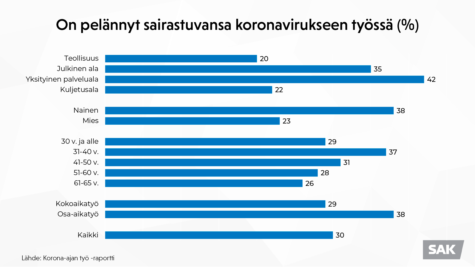 Runsaat fyysiset kontaktit näyttävät lisäävän pelkoa sairastumisesta. Vajaa kolmannes SAK:n jäsenkyselyn vastaajista on pelännyt sairastuvansa työssään koronavirukseen. Naisilla pelko on selvästi yleisempää (38 %) kuin miehillä (23 %).