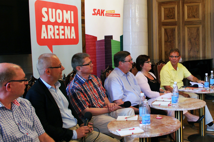 SAK:n paneellissa Metalliliiton puheenjohtaja Riku Aalto, JHL:n puheenjohtaja Jarkko Eloranta, Kuntatyönantajien työmarkkinajohtaja Markku Jalonen, EK:n johtaja Lasse Laatunen, PAM:n puheenjohtaja Ann Selin ja SAK:n puheenjohtaja Lauri Lyly.