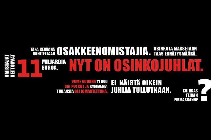 Pörssiyhtiöiden arvellaan maksavan tänä vuonna yli 11 miljardin euron osingot omistajilleen. Silti aivan viime aikoinakin monet teollisuusyritykset ovat käyneet isoja yhteistoimintaneuvotteluja ja vähentäneet niissä satoja TEAMin jäseniä. Osinkojuhlat 2016 -kampanjassa seurataankin erityisesti näiden yhtiöiden osinkopolitiikkaa.