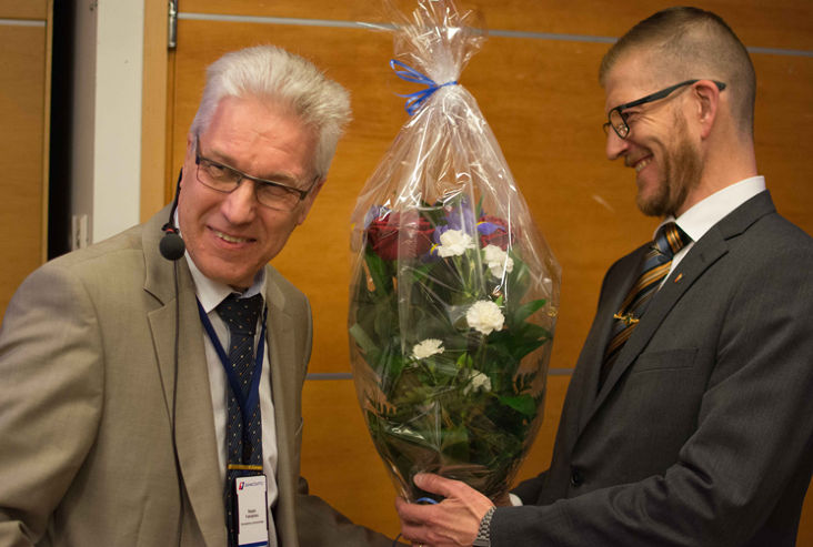 Sähköliiton edustajiston puheenjohtaja Seppo Fahlström (vasemmalla) kukittaa uuden puheenjohtajan, Tero Heiniluoman.