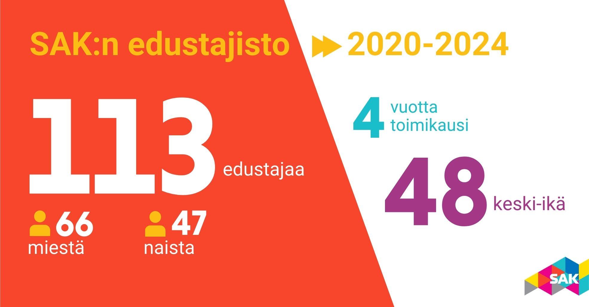 Uusi edustajisto kokoontuu nyt ensimmäistä kertaa ja sen tärkeimpiä tehtäviä tässä kokouksessa on valita SAK:n puheenjohtaja sekä SAK:n hallitus ja sen varapuheenjohtaja. Puheenjohtaja Jarkko Elorannalla ei ole vastaehdokasta, mutta varapuheenjohtajan paikka on auki nykyisen Matti Huutolan jäädessä eläkkeelle.