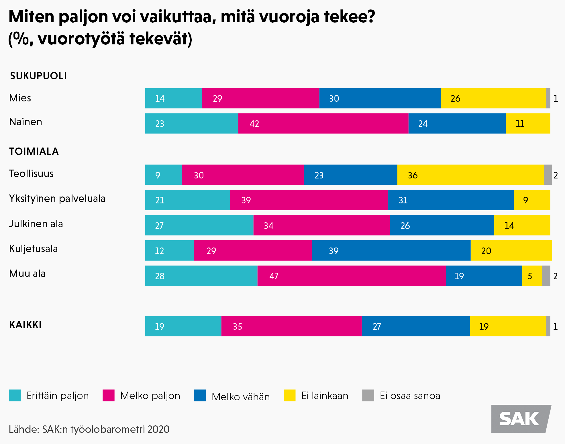 SAK:n työelämäbarometrin mukaan 54 prosenttia vuorotyötä tekevistä vastaajista voi vaikuttaa omiin työvuoroihinsa erittäin tai melko paljon. Valitettavasti jäljelle jää toinen puoli: 46 prosenttia voi vaikuttaa vain vähän tai ei ollenkaan.