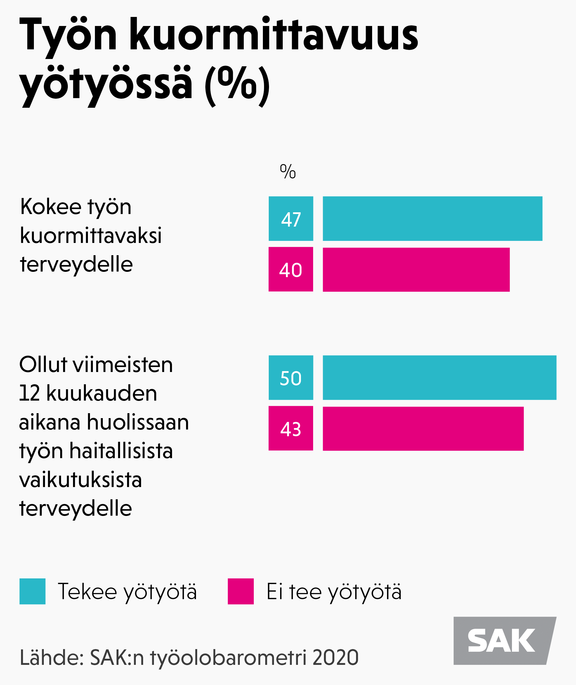 SAK:n työelämäbarometrissa kartoitetaan erilaisia työaikamuotoja ja niiden kuormittavuutta. Uusimman kyselyn mukaan vuoro- tai jaksotyötä tekee 62 prosenttia SAK:laisten liittojen jäsenistä. Yötyötä ainakin satunnaisesti tekee melkein neljännes (23 %). Nämä luvut ovat aivan kärkikastissa Euroopassa, ja samansuuntaisia tuloksia on saanut myös EU:n kolmikantainen työolojen kehittämisen virasto.