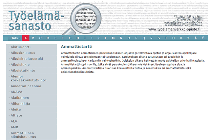 Osana Työelämän verkko-opistoa julkaistu Työelämäsanasto kokoaa yhteen työelämässä tarvittavia käsitteitä. Sanasto avaa termien merkityksiä niin ay-toiminnan, edunvalvonnan, järjestötoiminnan, talouden, aikuiskoulutuksen kuin sosiaaliturvankin kannalta. Työelämäsanaston käyttäjät voivat olla mukana kehittämässä sanastoa ehdottamalla siihen uusia, puuttuvia termejä verkkolomakkeen avulla.
