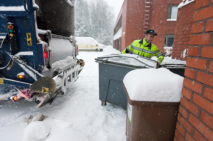 Pääluottamusmies Tapio Myller on tyytyväinen, että pääkaupunkiseudulla on pystytty vaikuttamaan kilpailutussääntöihin siten, että autolle vaaditaan kaksoismiehitys, joka hieman jakaa raskasta työn kuormaa. Jäteauton eli takalastaajan kuljettaja Jari Kujalakin vaihtaa parinsa kanssa tehtäviä – toinen ajaa ja toinen siirtää jäteastiat, mutta välillä siirtelyyn tarvitaan molempien voimat.