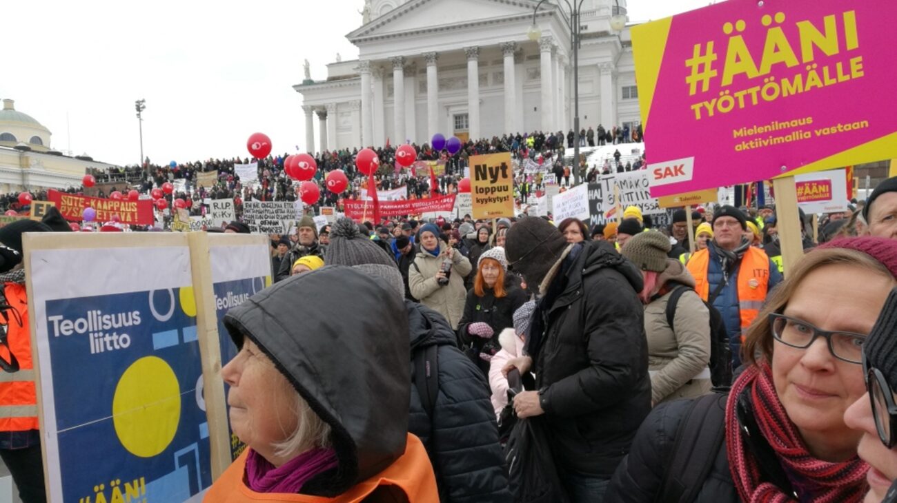 SAK haluaa yksinkertaistaa ja selkeyttää työttömyysturvaa. Kuva Ääni työttömälle -mielenilmauksesta helmikuulta 2018. Kuva Patrik Lindström.