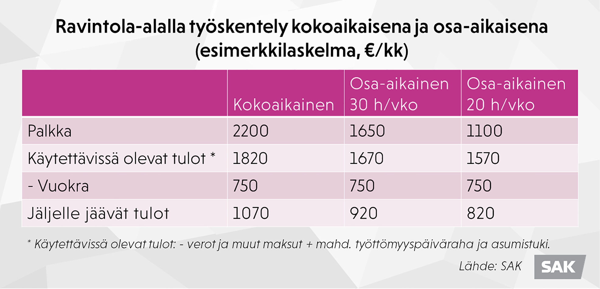 On helppo lähteä syyttämään ihmisiä laiskoiksi, jos kaikki työ ei kelpaa. Kuinka moni oikeasti tietää, millaisen toimeentulon tarjoaa osa-aikainen työ, jota esimerkiksi ravintola-alalla usein tehdään? Alla on esimerkki ravintola-alalla koko- ja osa-aikaisena työskentelevän henkilön keskiansioista kuukaudessa. 30 tuntia viikossa on alalla yleinen työaika. Esimerkkihenkilö asuu pääkaupunkiseudulla.