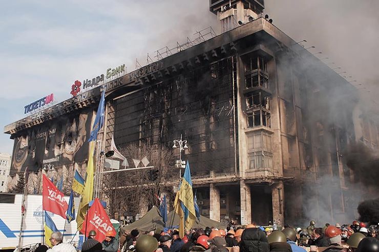 Ukrainan ammattiliittojen talo Kiovassa paloi helmikuussa. Yli 40 ammattiliittoa menetti keskustoimistonsa.