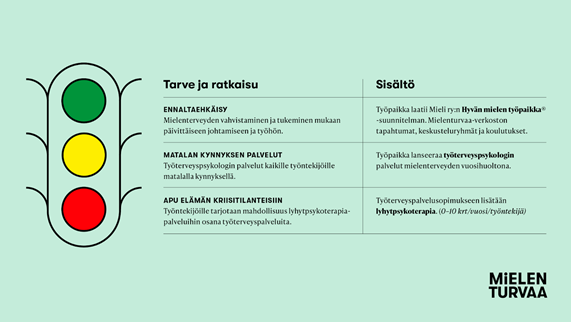 Tutkimustietoon pohjautuen verkosto on luonut Mielenturvaa-mallin, joka tarjoaa ratkaisuja hyvän mielenterveyden tukemiseen työpaikoilla. Mallin mukaisilla toimilla parannetaan työhyvinvointia ja vähennetään mielenterveysperustaisia sairauspoissaoloja sekä työkyvyttömyyseläkkeitä.
