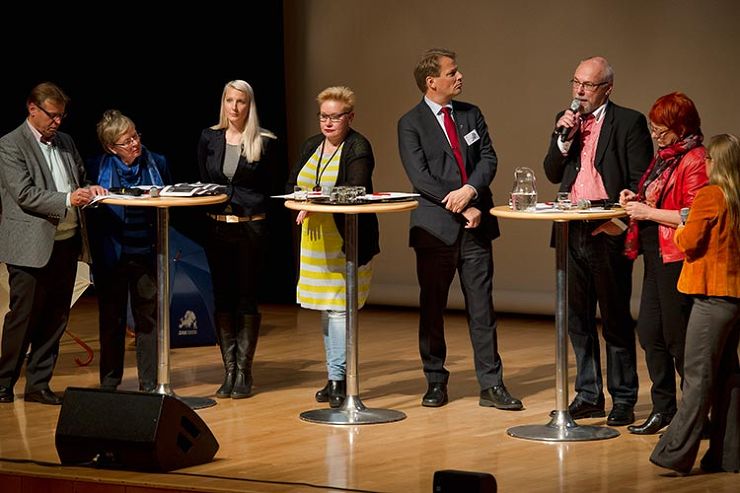 SAK:n eurovaalitentin panelistit lavalla: Liisa Jaakonsaari, Laura Huhtasaari, Sirpa Pietikäinen, Hannu Takkula, Erkki Virtanen ja Tarja Cronberg. Lavalla myös Lauri Lyly ja Jaana Pohja.