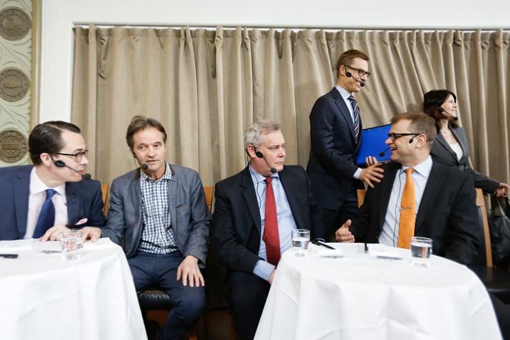 Carl Haglund (r.), Kari Uotila (vas.), Antti Rinne (sd.), Alexander Stubb (kok.), Juha Sipilä (kesk.) ja Outi Alanko-Kahiluoto (vihr.) Työelämän vaalitentissä maaliskuussa