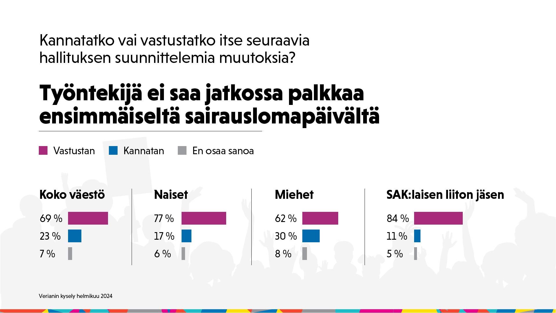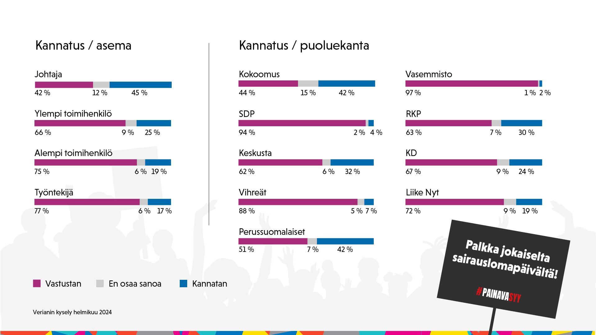 Suomalaisista 69 prosenttia vastustaa ensimmäisen sairauslomapäivän muuttamista palkattomaksi. Suosio ei ole suurta edes hallituspuolueiden kannattajissa.