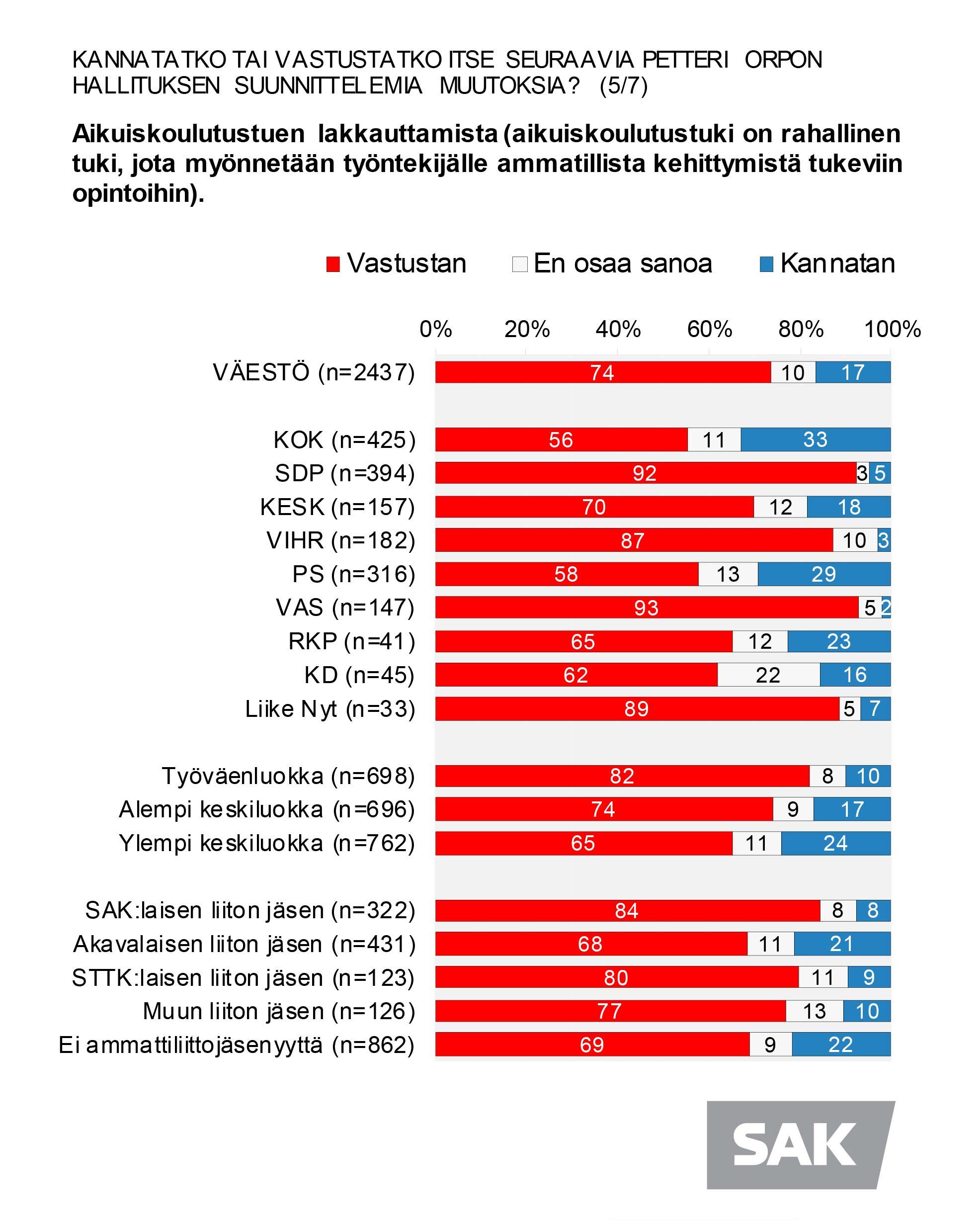 Kolme neljästä suomalaisesta vastustaa Orpon-Purran hallituksen suunnitelmaa lakkauttaa aikuiskoulutustuki. SAK:n Verianilla teettämään kyselyn mukaan 74 prosenttia vastustaa tuen lakkautusta ja vain 17 prosenttia kannattaa.
