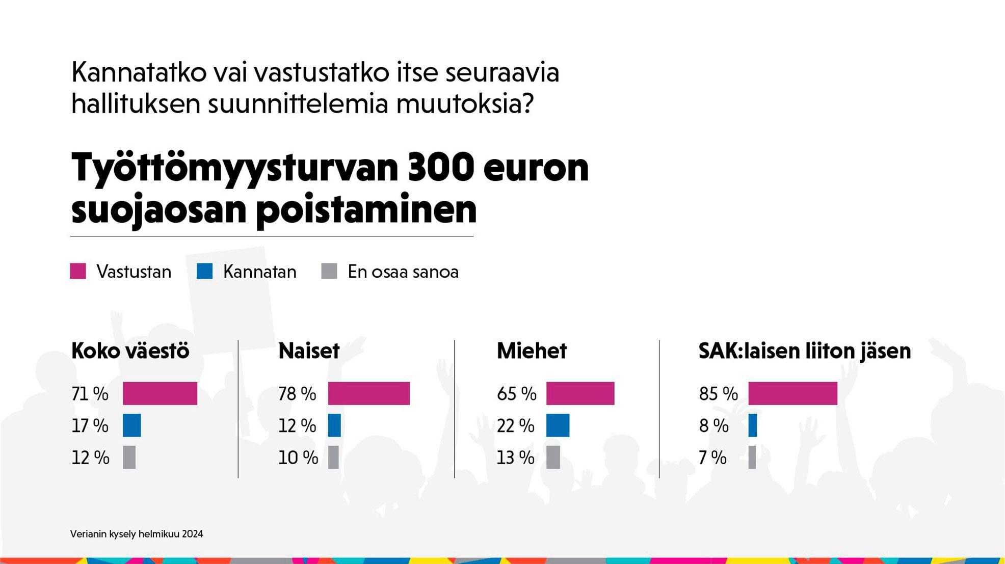 Verianin tekemän tutkimuksen mukaan suomalaisista jopa 71 prosenttia vastustaa suojaosan poistamista. Leikkaus on tulossa voimaan 1. huhtikuuta. Sen vaikutus on iso, sillä kaikista ansiopäivärahan saajista noin 40 prosenttia saa etuutta soviteltuna, monilla SAK:laisilla aloilla jopa sitä useampi.