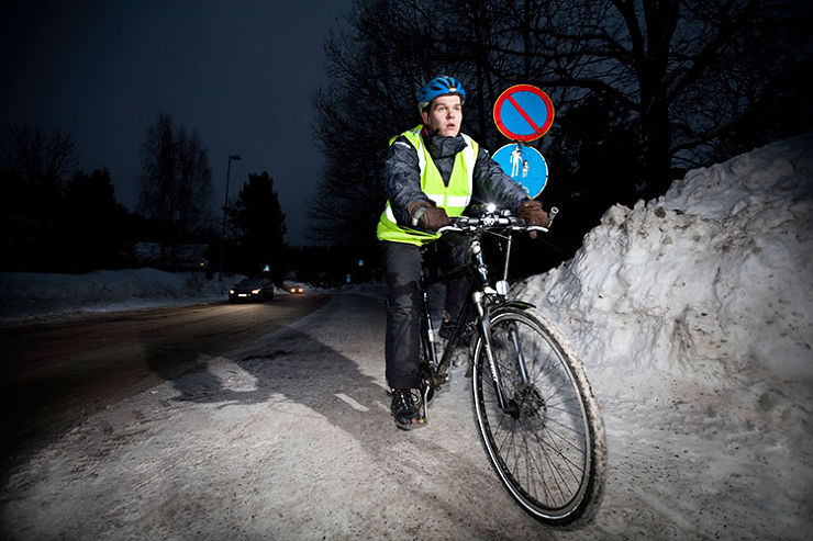 Pyörässä itsessään on monia heijastimia, mutta heijastinliivit lisäävät olennaisesti näkyvyyttä. Pyörässä pitää olla toimiva valo, joka näyttää valkoista valoa eteenpäin.