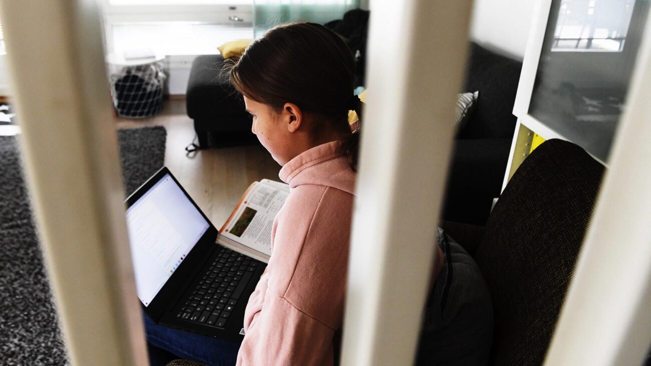 Keväällä 2020 myös yläkouluissa opiskeltiin etänä. Kahdeksasluokkalainen tyttö etäopiskelee kotonaan Espoossa. Kuva: Vesa Moilanen / Lehtikuva.