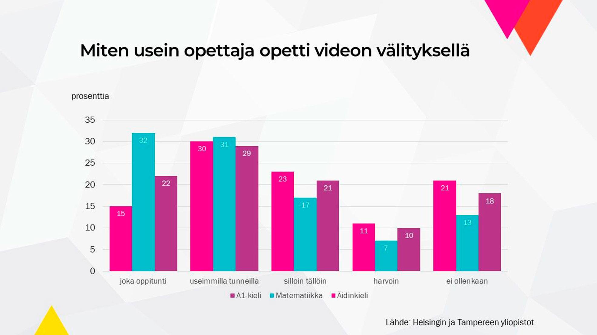 Suurimmassa osassa kouluja opetus pyrittiin järjestämään edes osittain lukujärjestyksen mukaisesti ja niin, että opettaja oli säännöllisesti oppilaiden tavoitettavissa, mutta jopa viidennes yläkoululaisista kertoo, ettei videovälitteistä opetusta järjestetty äidinkielessä, matematiikassa ja A1-kielessä lainkaan. Toisilla tärkein kontakti opettajaan oli vain Wilmassa lähetetty tehtävälista, kun taas toiset saivat opettajaansa yhteyden säännöllisesti ja helposti.