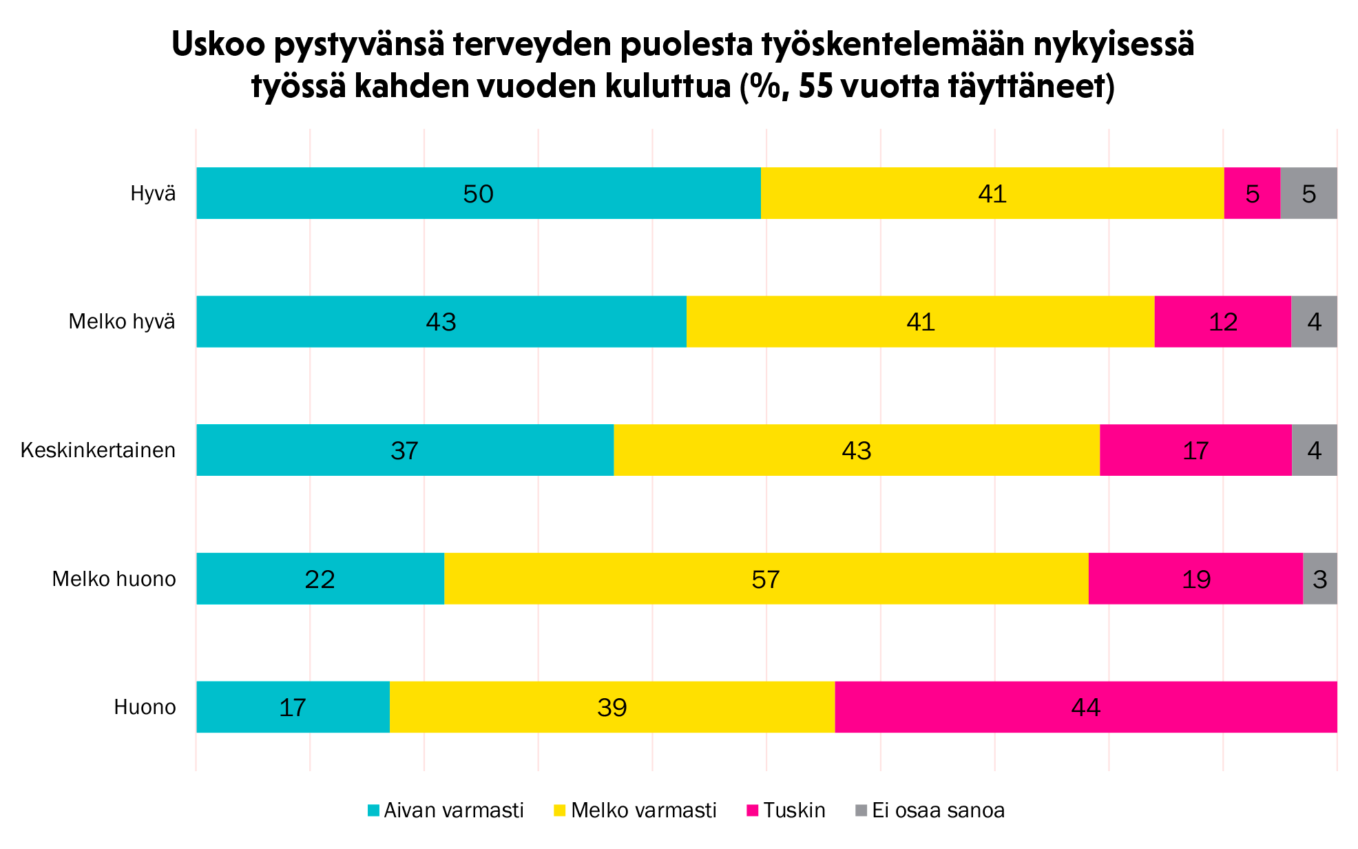 Sen sijaan puolet (50 %) hyvillä työpaikoilla töitä tekevistä oli aivan varmoja siitä, että he ovat terveytensä puolesta kykeneviä vielä kahden vuoden kuluttua jatkamaan nykyisessä työssään.