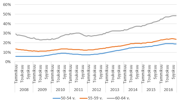 Työnvälitystilastot osoittavat, että työttömäksi jääneiden 50–64 vuotiaiden pitkittyneen työttömyyden riski on kasvanut. Vielä 2008 vain kuusi prosenttia työttömäksi jääneistä 50–54 vuotiaista oli työttöminä vähintään 12 kuukautta, mutta nyt vastaava osuus on kolminkertainen. Parhaimmillaan 60–64 vuotiaina työttömäksi jääneistä vajaa neljännes (23 %) oli työttöminä yli vuoden, mutta nyt osuus on melkein puolet (48 %).