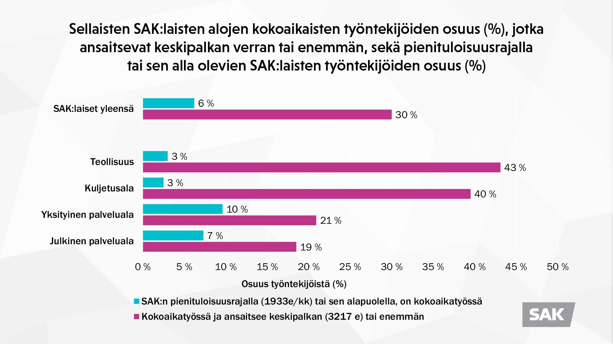 Keskimäärin kuusi prosenttia – noin 50 000 – SAK:laisten alojen työntekijöistä on sellaisia kokoaikaisia, joiden ansiot jäävät SAK:n määrittelemän alimman hyväksyttävän kokoaikatyöstä maksettavan palkan (1 933 euroa/kk) alapuolelle. Yleisimmin tämä koskee palvelualoja, joiden kokoaikatyötä tekevistä työntekijöistä 7–10 prosenttia ansaitsee alle 1 933 euroa kuussa. Kokoaikatyö suojaa parhaiten pienituloisuudelta teollisuudessa ja kuljetusalalla, joiden kokoaikaisista työntekijöistä kolme prosenttia jää SAK:n pienituloisuusrajan alapuolelle.