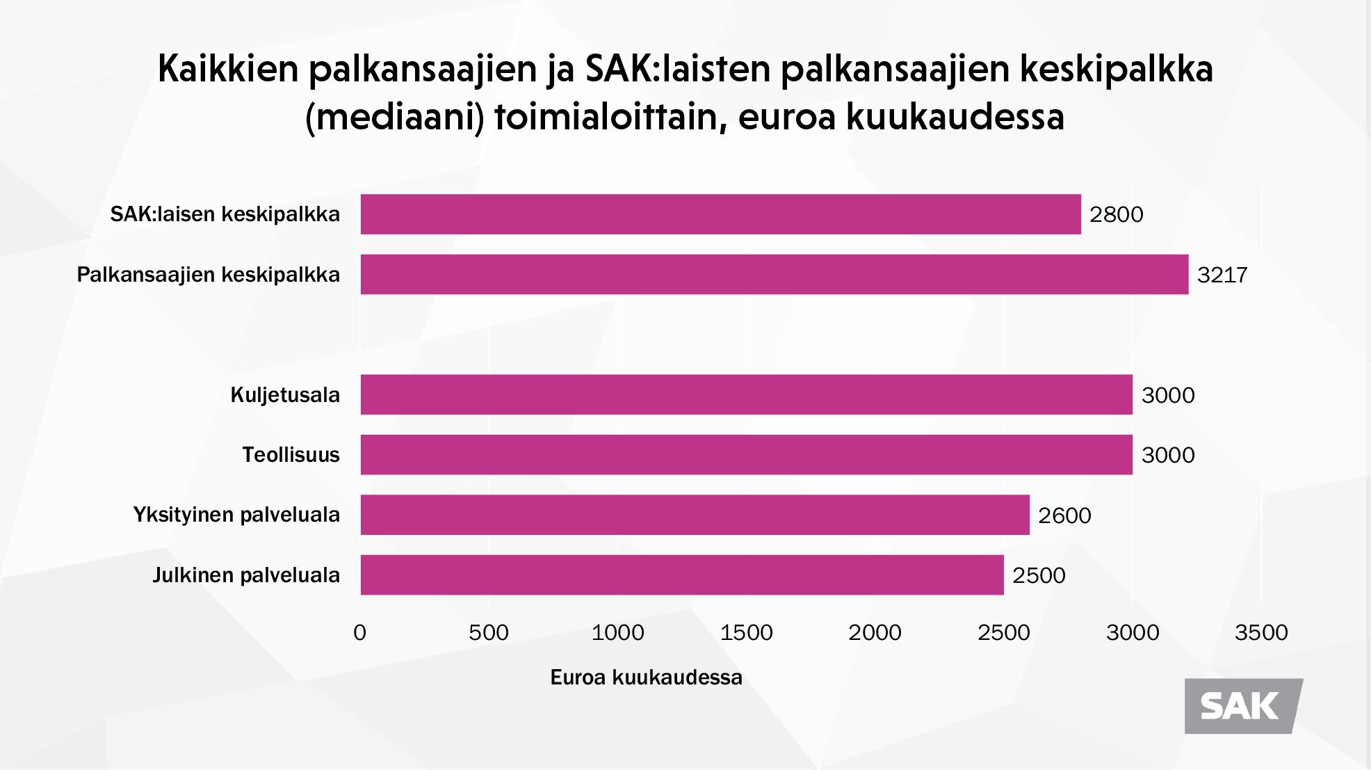 SAK:laisten työntekijöiden keskipalkka on 2 800 euroa kuukaudessa. Teollisuudessa ja kuljetusalalla SAK:laisten keskiansio on 3 000 euroa kuukaudessa. Yksityisellä palvelualalla vastaava luku on 2 600 euroa ja julkisilla palvelualoilla 2500 euroa kuukaudessa