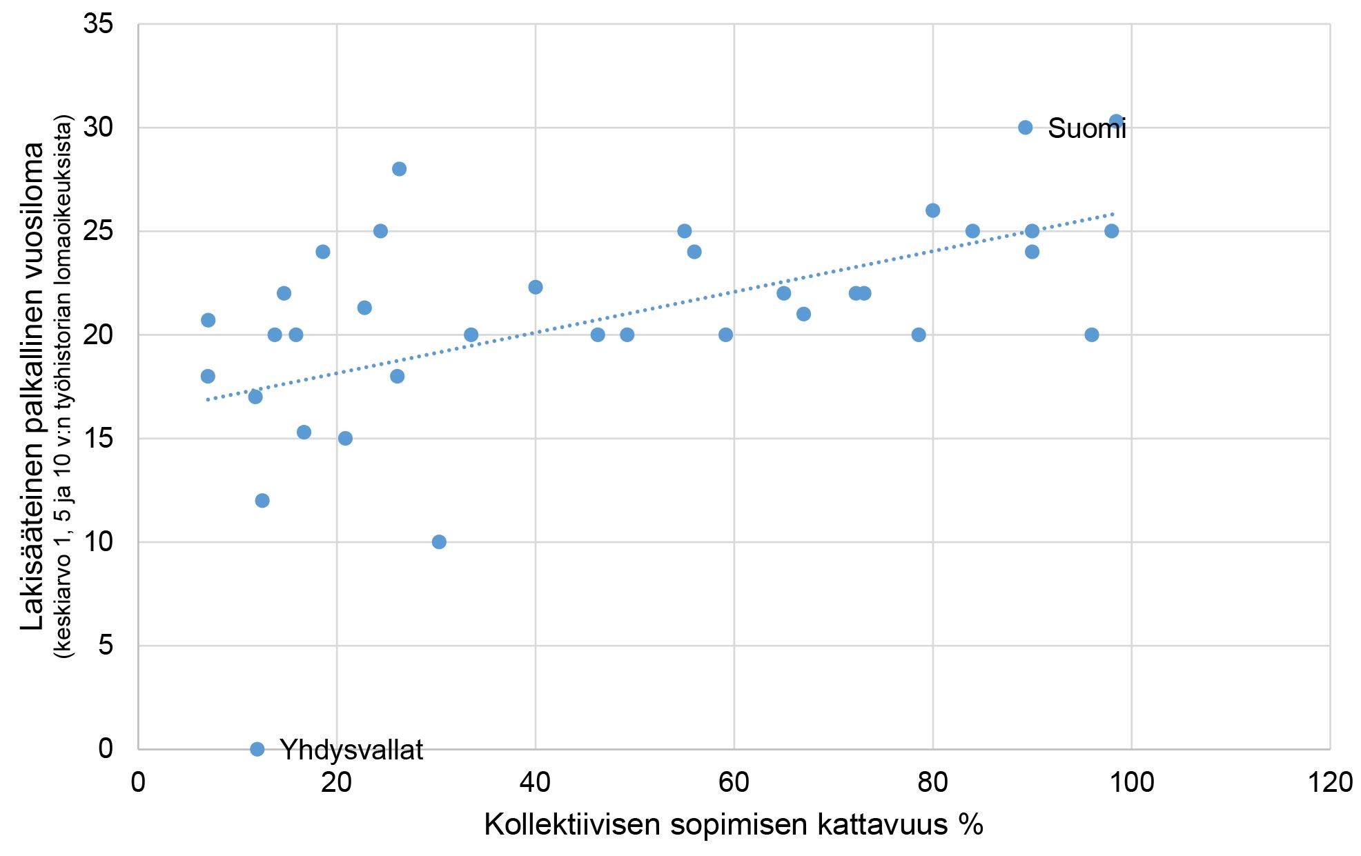 Tämä ei ole pelkkää teoriaa, vaan vertailemalla eri maita nähdään, että kollektiivinen työehdoista sopiminen on yhteydessä pidempiin lomiin.