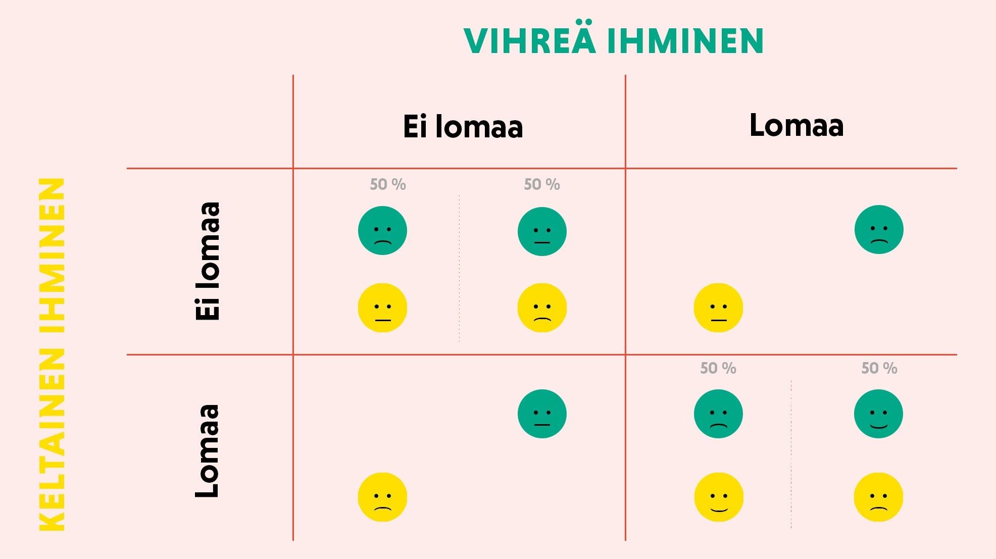 Peliteoreettista valintaa voi konkretisoida tällaisella vangin dilemmastakin tutulla matriisilla, joka kuvastaa miten vihreä ja keltainen ihminen kilpailevat samasta työpaikasta ja valitsevat, vaativatko palkallista lomaa työhaastattelussa: